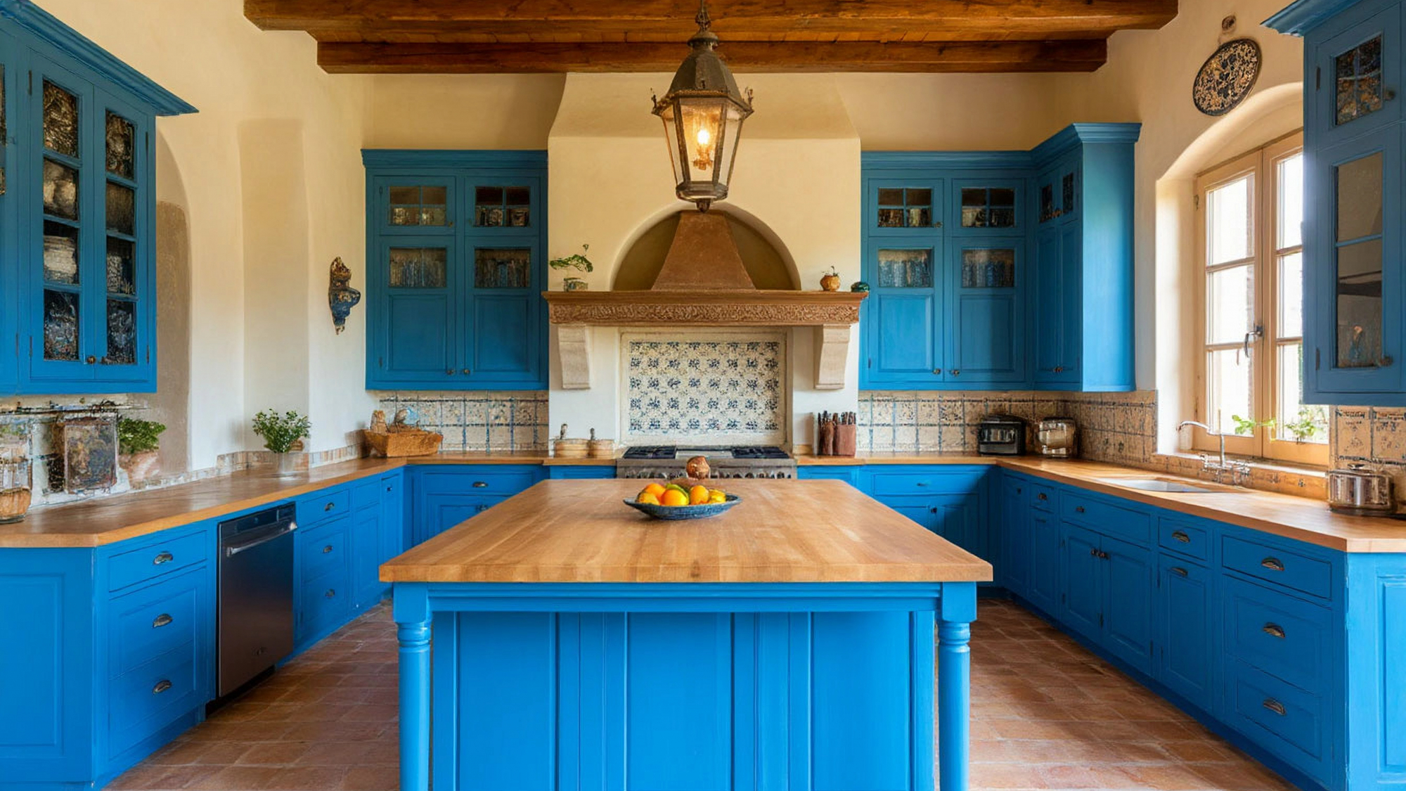 Материалы кухни подчёркивают её средиземноморский характер. Голубой фасад гармонирует с натуральными текстурами дерева и камня, создавая ощущение близости к природе и лёгкости. Металлические элементы — ручки, петли и аксессуары — выполнены в стиле старинной кованой работы, что добавляет кухне особый шарм и характер. Текстильные элементы, например, шторы, салфетки и коврики, с морскими мотивами, делают интерьер уютным и живым, усиливая эффект пребывания на побережье.